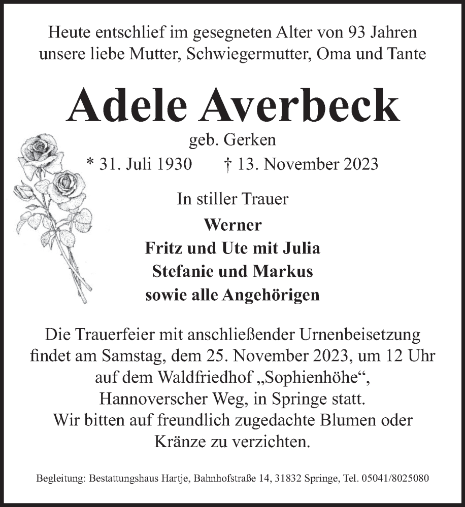 Hier finden Sie alle Traueranzeigen aus der Zeitung, die bisher für Adele Averbeck erschienen sind. Weitere Traueranzeigen, die in der Zeitung erscheinen, werden hier ebenfalls aufgelistet