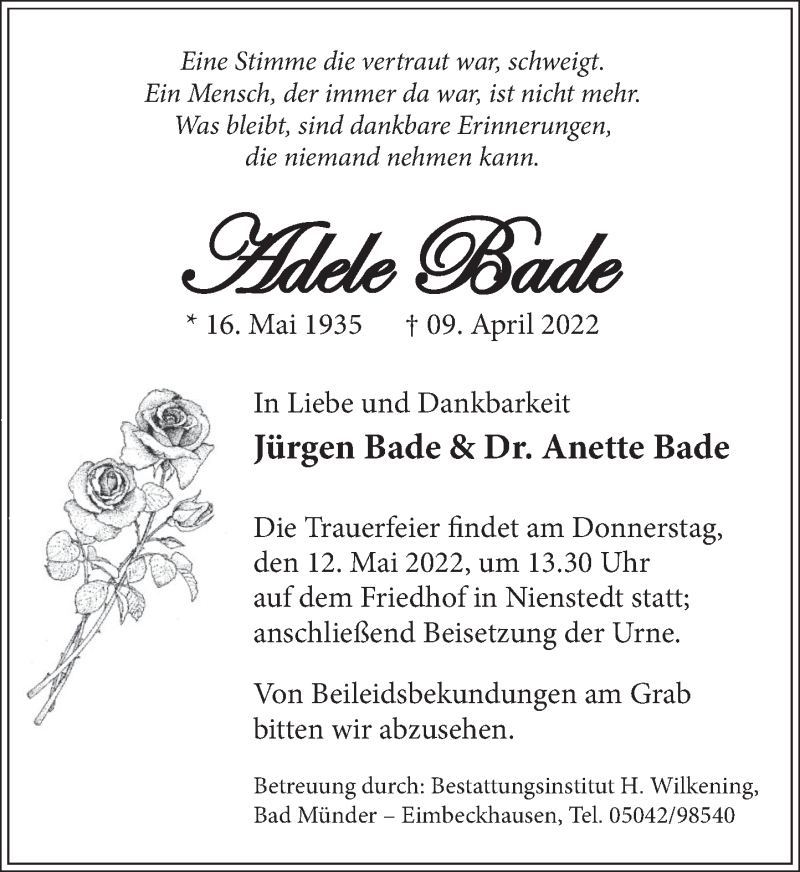 Hier finden Sie alle Traueranzeigen aus der Zeitung, die bisher für Adele Bade erschienen sind. Weitere Traueranzeigen, die in der Zeitung erscheinen, werden hier ebenfalls aufgelistet