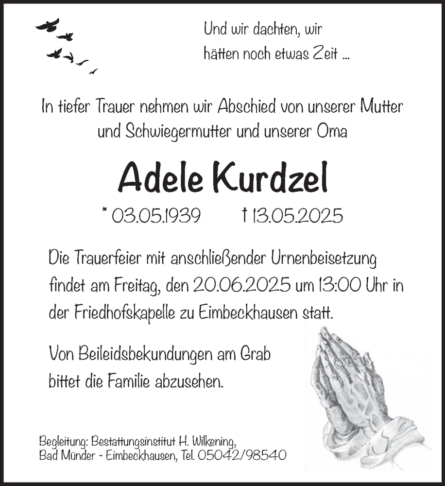 Hier finden Sie alle Traueranzeigen aus der Zeitung, die bisher für Adele Kurdzel erschienen sind. Weitere Traueranzeigen, die in der Zeitung erscheinen, werden hier ebenfalls aufgelistet