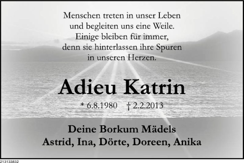 Hier finden Sie alle Traueranzeigen aus der Zeitung, die bisher für Adieu Katrin erschienen sind. Weitere Traueranzeigen, die in der Zeitung erscheinen, werden hier ebenfalls aufgelistet