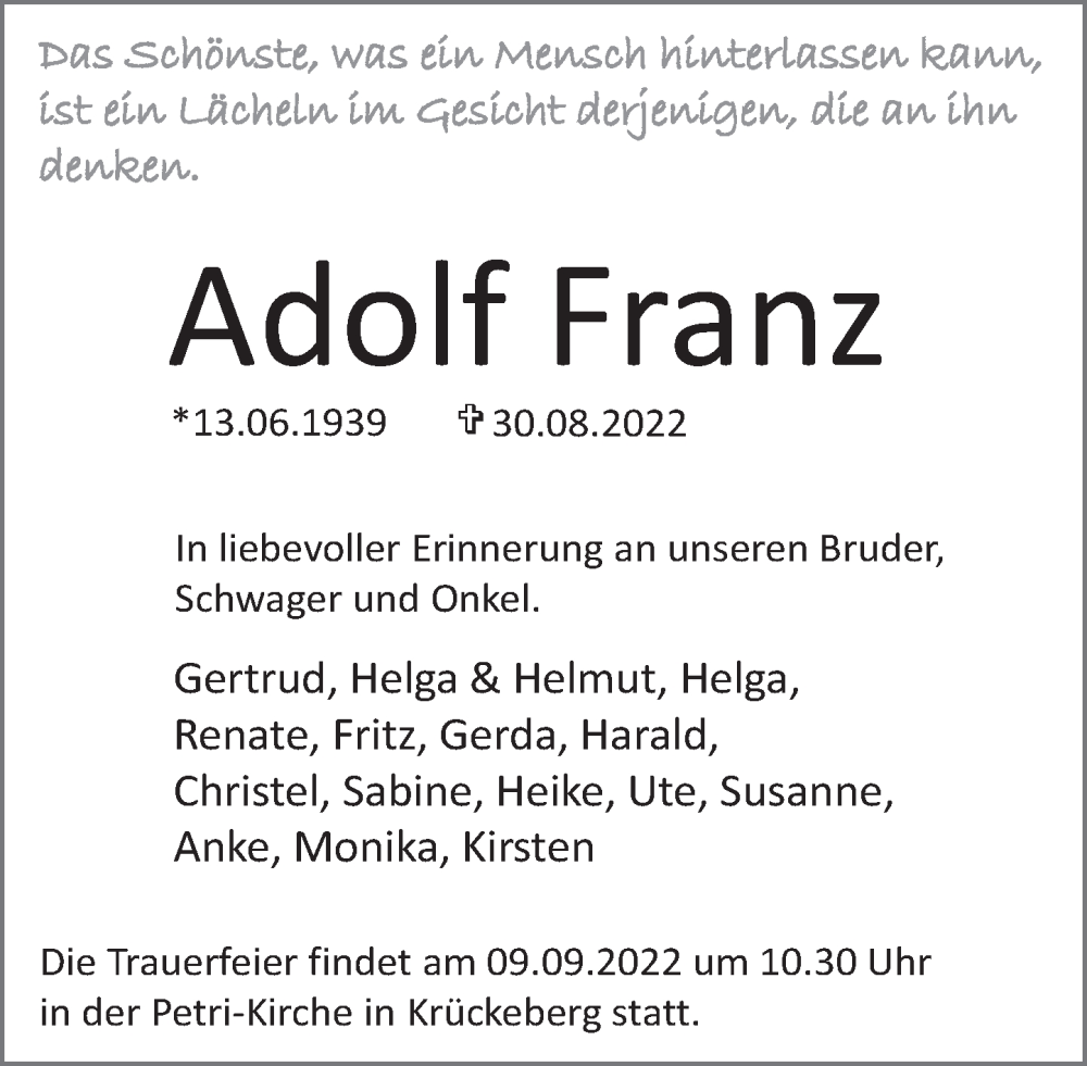 Hier finden Sie alle Traueranzeigen aus der Zeitung, die bisher für Adolf Franz erschienen sind. Weitere Traueranzeigen, die in der Zeitung erscheinen, werden hier ebenfalls aufgelistet