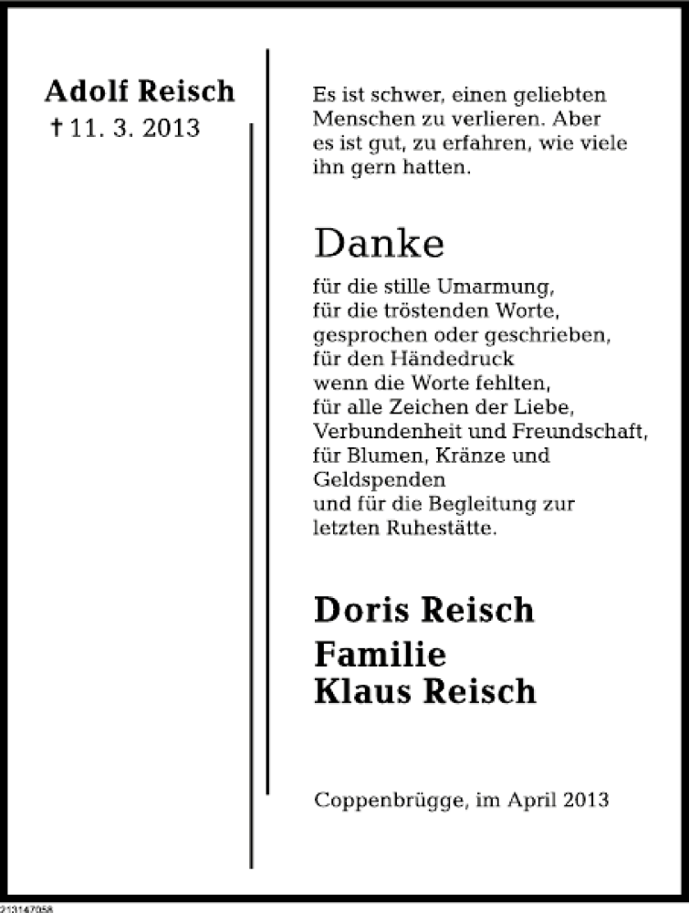 Hier finden Sie alle Traueranzeigen aus der Zeitung, die bisher für Adolf Reisch erschienen sind. Weitere Traueranzeigen, die in der Zeitung erscheinen, werden hier ebenfalls aufgelistet