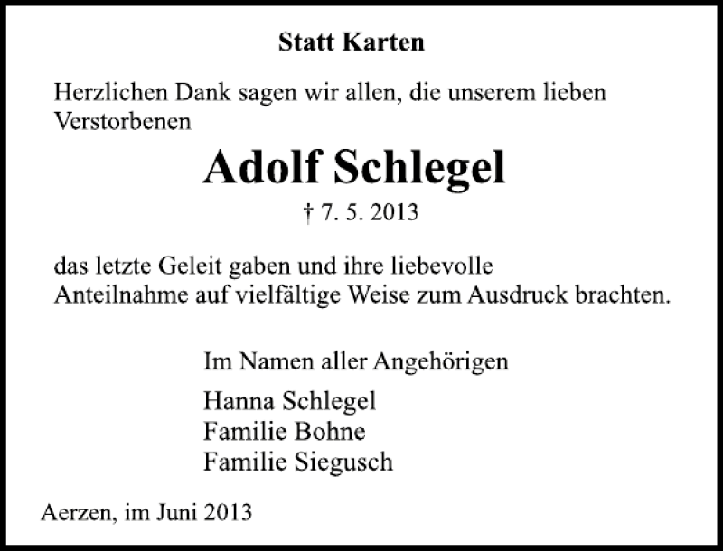 Hier finden Sie alle Traueranzeigen aus der Zeitung, die bisher für Adolf Schlegel erschienen sind. Weitere Traueranzeigen, die in der Zeitung erscheinen, werden hier ebenfalls aufgelistet