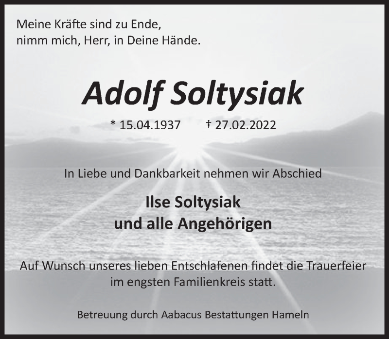 Hier finden Sie alle Traueranzeigen aus der Zeitung, die bisher für Adolf Soltysiak erschienen sind. Weitere Traueranzeigen, die in der Zeitung erscheinen, werden hier ebenfalls aufgelistet