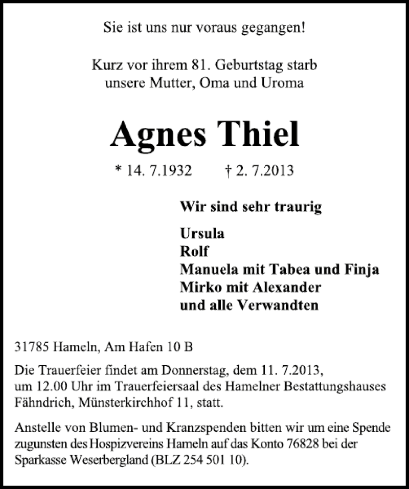 Hier finden Sie alle Traueranzeigen aus der Zeitung, die bisher für Agnes Thiel erschienen sind. Weitere Traueranzeigen, die in der Zeitung erscheinen, werden hier ebenfalls aufgelistet