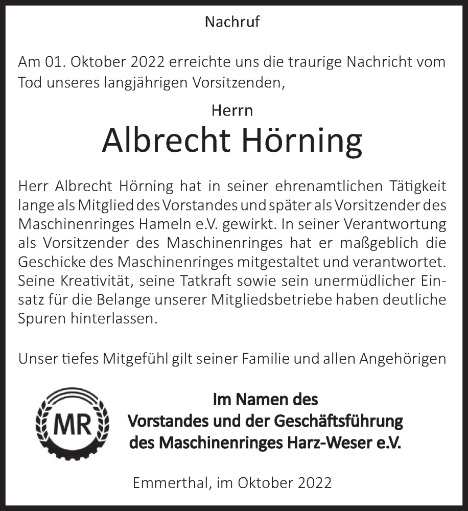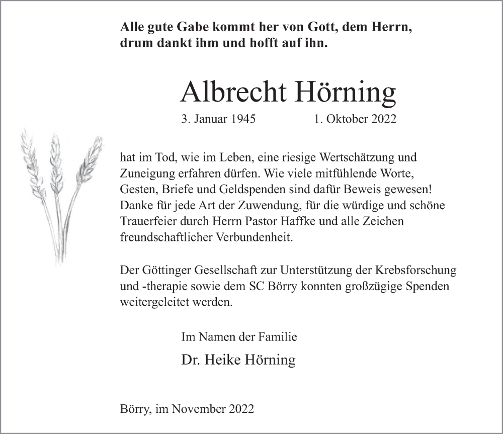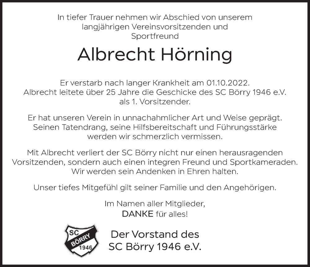 Hier finden Sie alle Traueranzeigen aus der Zeitung, die bisher für Albrecht Hörning erschienen sind. Weitere Traueranzeigen, die in der Zeitung erscheinen, werden hier ebenfalls aufgelistet
