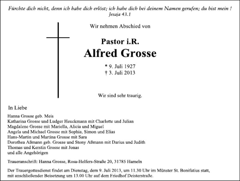 Hier finden Sie alle Traueranzeigen aus der Zeitung, die bisher für Alfred Grosse erschienen sind. Weitere Traueranzeigen, die in der Zeitung erscheinen, werden hier ebenfalls aufgelistet