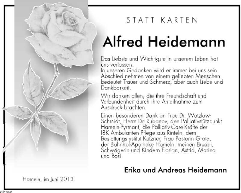 Hier finden Sie alle Traueranzeigen aus der Zeitung, die bisher für Alfred Heidemann erschienen sind. Weitere Traueranzeigen, die in der Zeitung erscheinen, werden hier ebenfalls aufgelistet