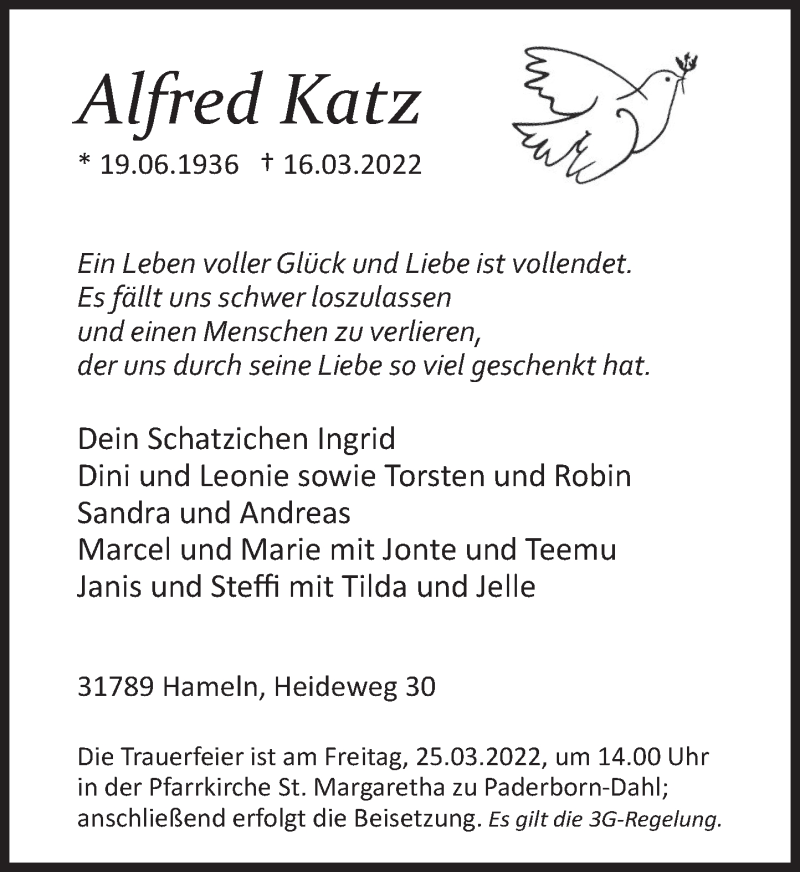 Hier finden Sie alle Traueranzeigen aus der Zeitung, die bisher für Alfred Katz erschienen sind. Weitere Traueranzeigen, die in der Zeitung erscheinen, werden hier ebenfalls aufgelistet