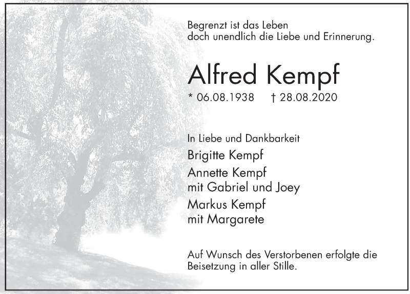 Hier finden Sie alle Traueranzeigen aus der Zeitung, die bisher für Alfred Kempf erschienen sind. Weitere Traueranzeigen, die in der Zeitung erscheinen, werden hier ebenfalls aufgelistet