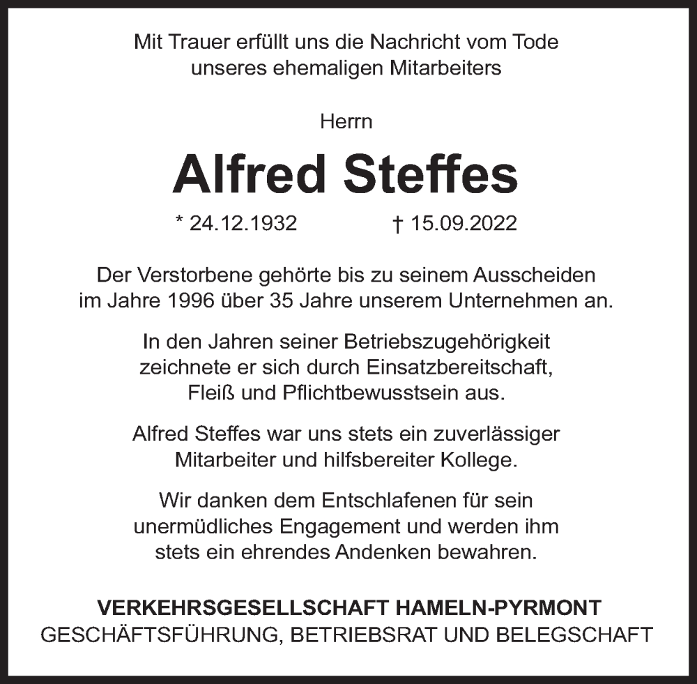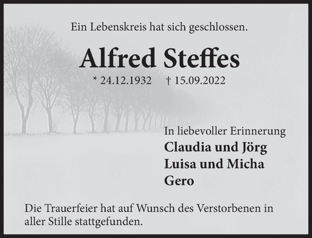 Hier finden Sie alle Traueranzeigen aus der Zeitung, die bisher für Alfred Steffes erschienen sind. Weitere Traueranzeigen, die in der Zeitung erscheinen, werden hier ebenfalls aufgelistet