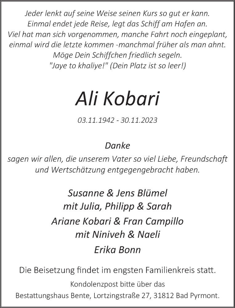 Hier finden Sie alle Traueranzeigen aus der Zeitung, die bisher für Ali Kobari erschienen sind. Weitere Traueranzeigen, die in der Zeitung erscheinen, werden hier ebenfalls aufgelistet