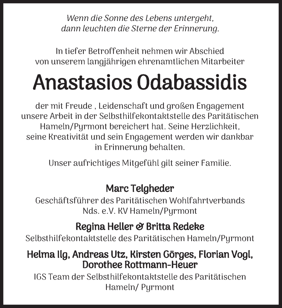 Hier finden Sie alle Traueranzeigen aus der Zeitung, die bisher für Anastasios Odabassidis erschienen sind. Weitere Traueranzeigen, die in der Zeitung erscheinen, werden hier ebenfalls aufgelistet