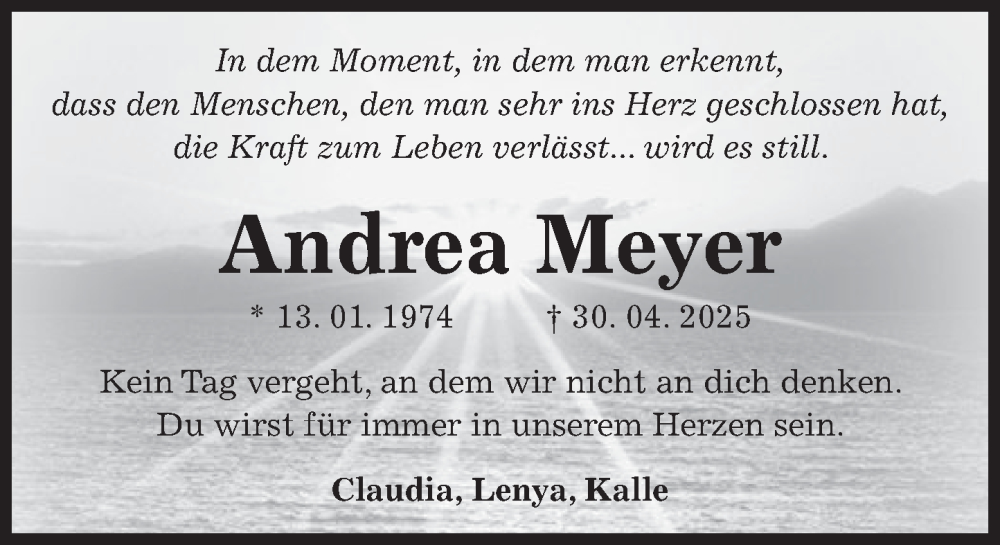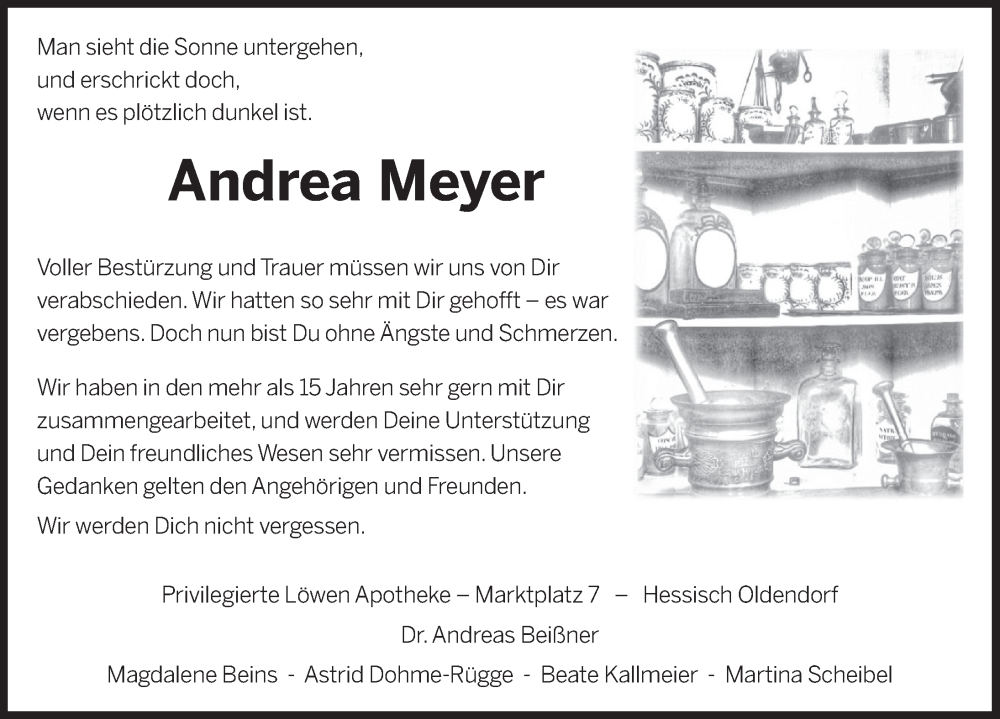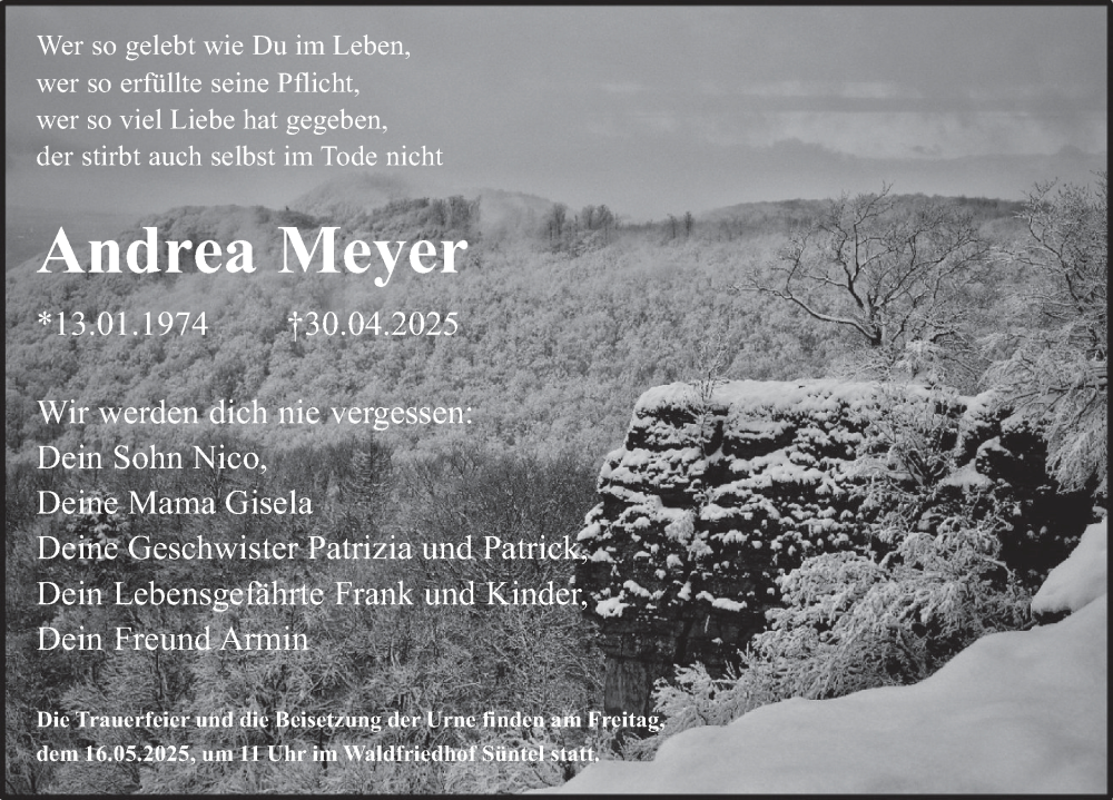 Hier finden Sie alle Traueranzeigen aus der Zeitung, die bisher für Andrea Meyer erschienen sind. Weitere Traueranzeigen, die in der Zeitung erscheinen, werden hier ebenfalls aufgelistet