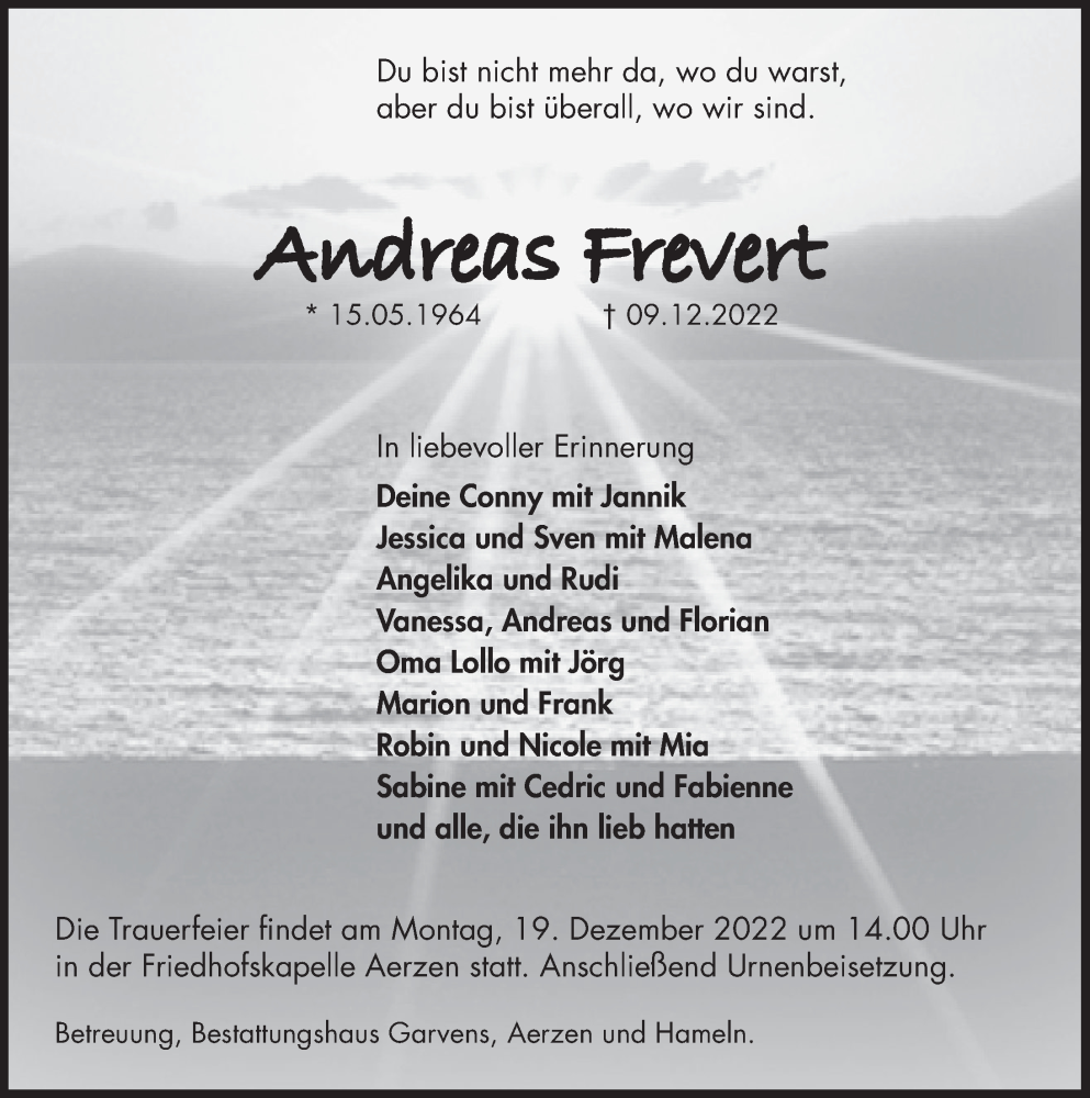 Hier finden Sie alle Traueranzeigen aus der Zeitung, die bisher für Andreas Frevert erschienen sind. Weitere Traueranzeigen, die in der Zeitung erscheinen, werden hier ebenfalls aufgelistet