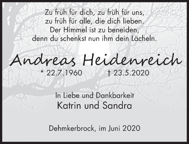 Hier finden Sie alle Traueranzeigen aus der Zeitung, die bisher für Andreas Heidenreich erschienen sind. Weitere Traueranzeigen, die in der Zeitung erscheinen, werden hier ebenfalls aufgelistet
