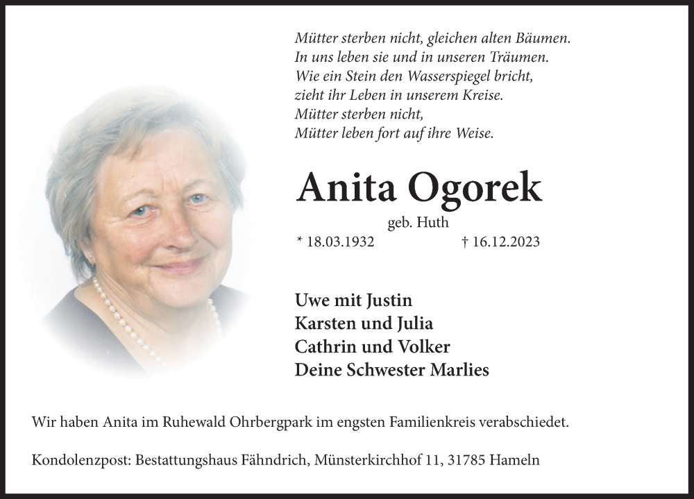 Hier finden Sie alle Traueranzeigen aus der Zeitung, die bisher für Anita Ogorek erschienen sind. Weitere Traueranzeigen, die in der Zeitung erscheinen, werden hier ebenfalls aufgelistet