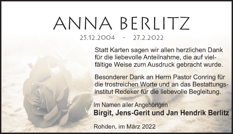 Hier finden Sie alle Traueranzeigen aus der Zeitung, die bisher für Anna Berlitz erschienen sind. Weitere Traueranzeigen, die in der Zeitung erscheinen, werden hier ebenfalls aufgelistet