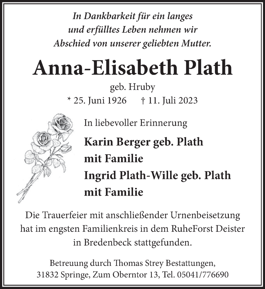 Hier finden Sie alle Traueranzeigen aus der Zeitung, die bisher für Anna-Elisabeth Plath erschienen sind. Weitere Traueranzeigen, die in der Zeitung erscheinen, werden hier ebenfalls aufgelistet