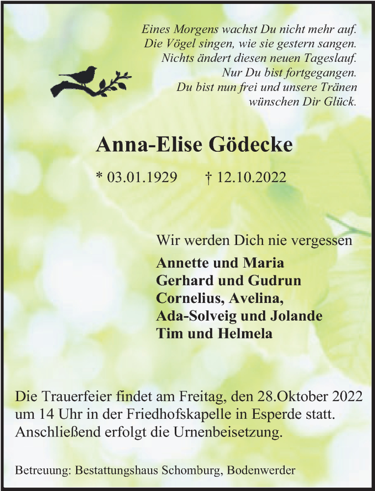 Hier finden Sie alle Traueranzeigen aus der Zeitung, die bisher für Anna-Elise Gödecke erschienen sind. Weitere Traueranzeigen, die in der Zeitung erscheinen, werden hier ebenfalls aufgelistet