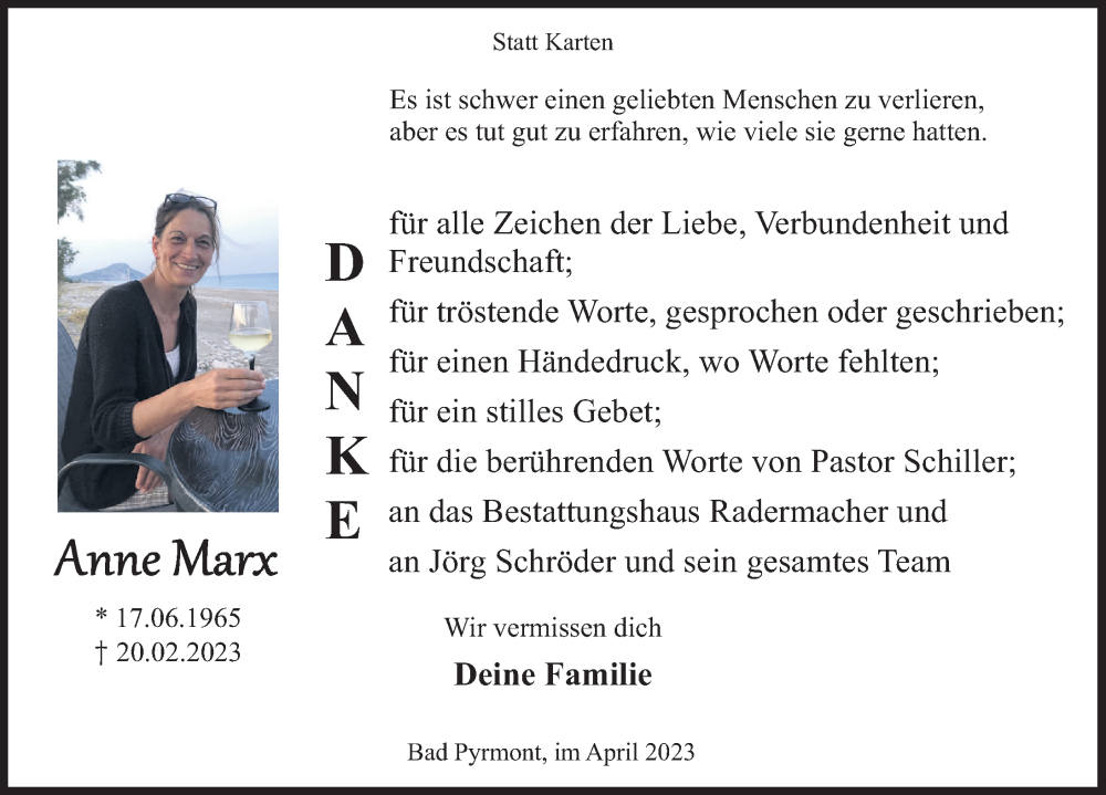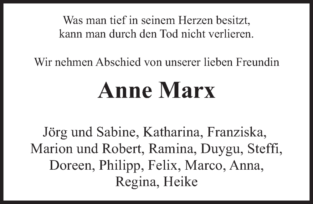 Hier finden Sie alle Traueranzeigen aus der Zeitung, die bisher für Anne Marx erschienen sind. Weitere Traueranzeigen, die in der Zeitung erscheinen, werden hier ebenfalls aufgelistet