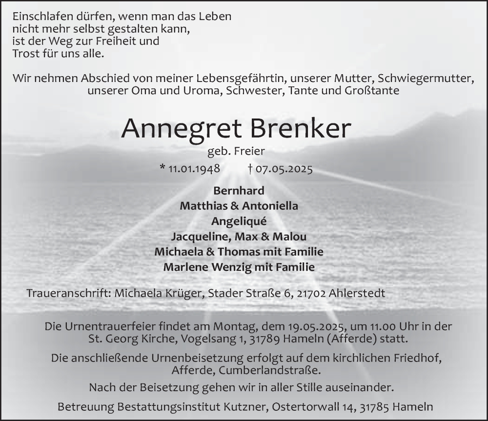 Hier finden Sie alle Traueranzeigen aus der Zeitung, die bisher für Annegret Brenker erschienen sind. Weitere Traueranzeigen, die in der Zeitung erscheinen, werden hier ebenfalls aufgelistet