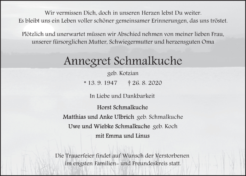 Hier finden Sie alle Traueranzeigen aus der Zeitung, die bisher für Annegret Schmalkuche erschienen sind. Weitere Traueranzeigen, die in der Zeitung erscheinen, werden hier ebenfalls aufgelistet