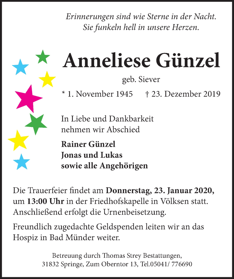 Hier finden Sie alle Traueranzeigen aus der Zeitung, die bisher für Anneliese Günzel erschienen sind. Weitere Traueranzeigen, die in der Zeitung erscheinen, werden hier ebenfalls aufgelistet