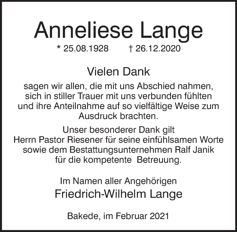 Hier finden Sie alle Traueranzeigen aus der Zeitung, die bisher für Anneliese Lange erschienen sind. Weitere Traueranzeigen, die in der Zeitung erscheinen, werden hier ebenfalls aufgelistet