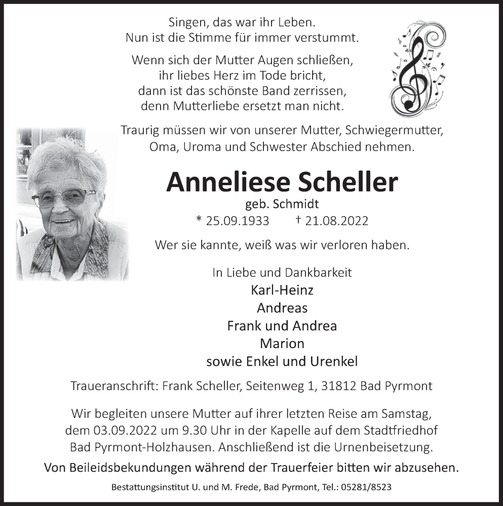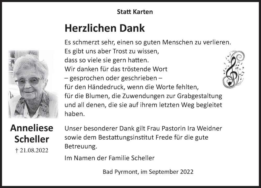 Hier finden Sie alle Traueranzeigen aus der Zeitung, die bisher für Anneliese Scheller erschienen sind. Weitere Traueranzeigen, die in der Zeitung erscheinen, werden hier ebenfalls aufgelistet