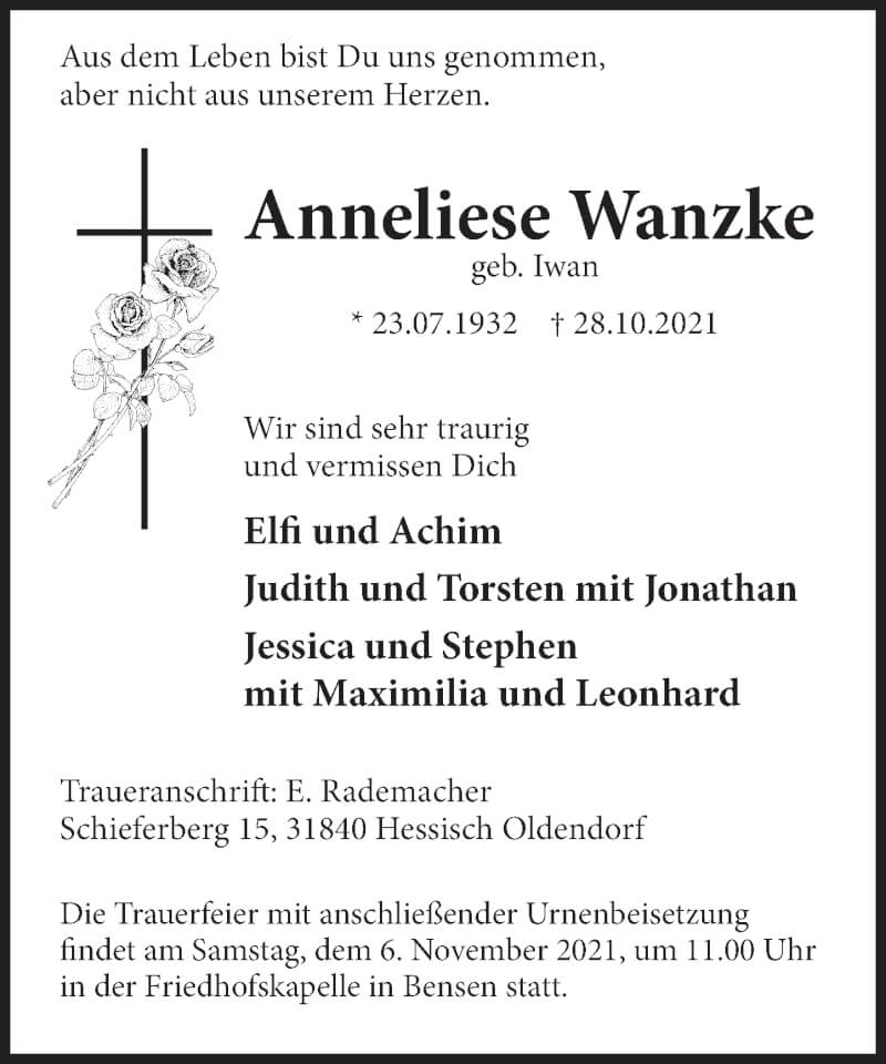 Hier finden Sie alle Traueranzeigen aus der Zeitung, die bisher für Anneliese Wanzke erschienen sind. Weitere Traueranzeigen, die in der Zeitung erscheinen, werden hier ebenfalls aufgelistet