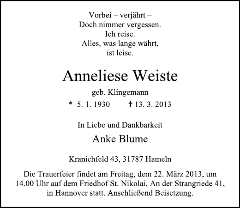 Hier finden Sie alle Traueranzeigen aus der Zeitung, die bisher für Anneliese Weiste erschienen sind. Weitere Traueranzeigen, die in der Zeitung erscheinen, werden hier ebenfalls aufgelistet