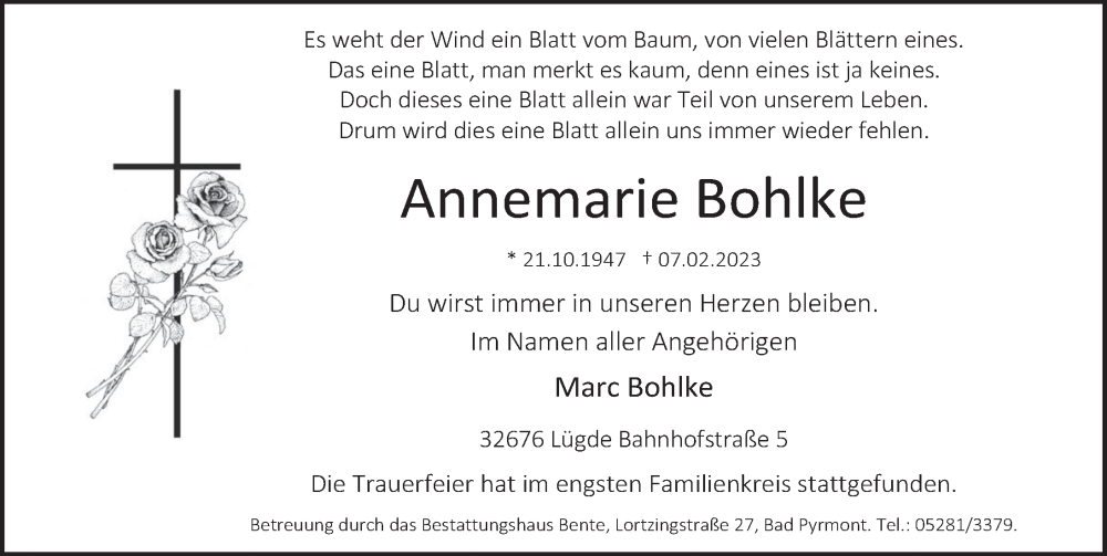 Hier finden Sie alle Traueranzeigen aus der Zeitung, die bisher für Annemarie Bohlke erschienen sind. Weitere Traueranzeigen, die in der Zeitung erscheinen, werden hier ebenfalls aufgelistet