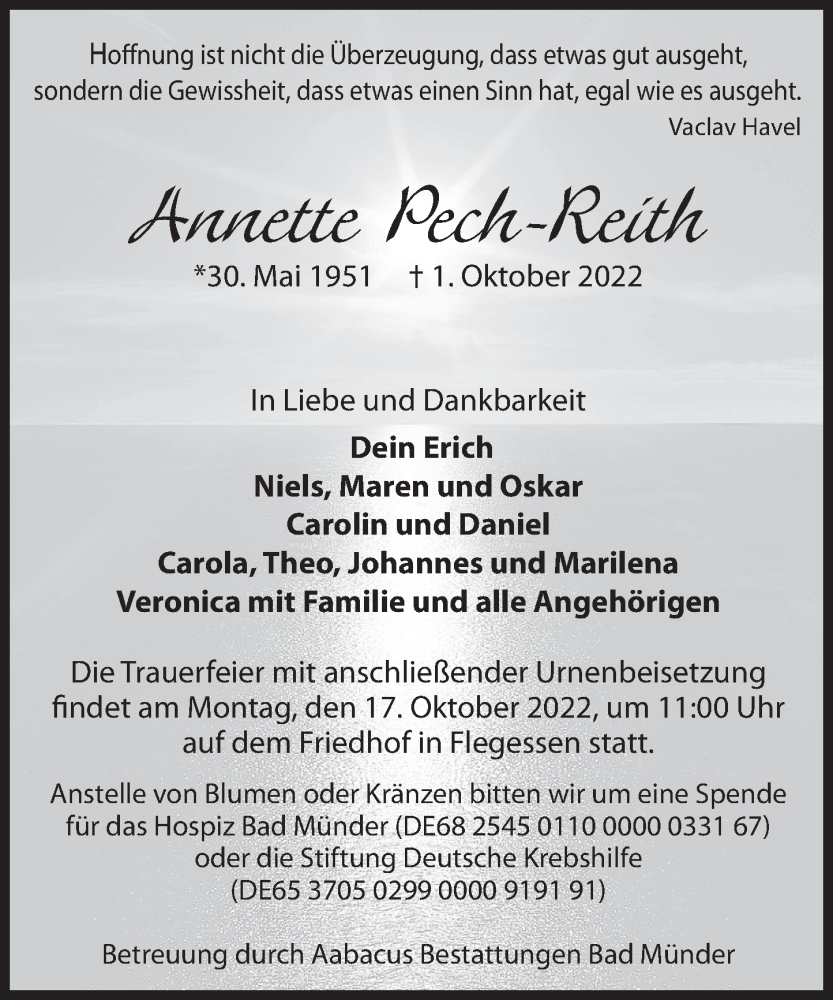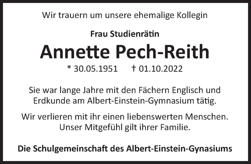 Hier finden Sie alle Traueranzeigen aus der Zeitung, die bisher für Annette Pech-Reith erschienen sind. Weitere Traueranzeigen, die in der Zeitung erscheinen, werden hier ebenfalls aufgelistet