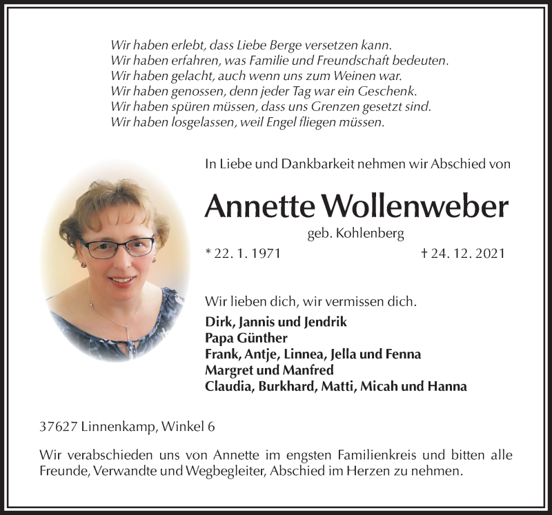 Hier finden Sie alle Traueranzeigen aus der Zeitung, die bisher für Annette Wollenweber erschienen sind. Weitere Traueranzeigen, die in der Zeitung erscheinen, werden hier ebenfalls aufgelistet