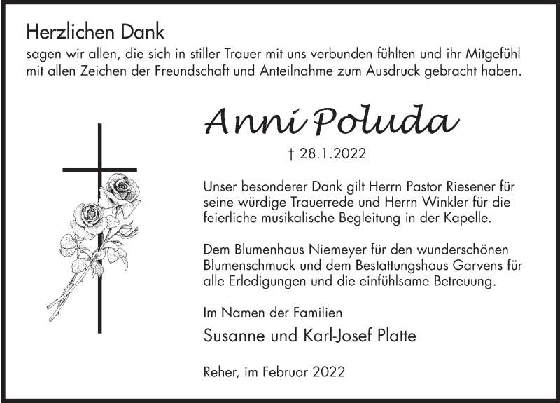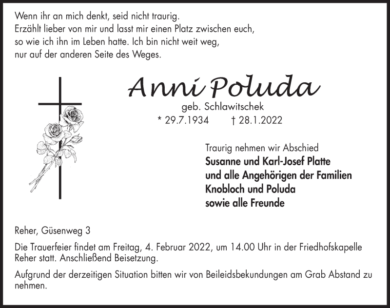 Hier finden Sie alle Traueranzeigen aus der Zeitung, die bisher für Anni Poluda erschienen sind. Weitere Traueranzeigen, die in der Zeitung erscheinen, werden hier ebenfalls aufgelistet