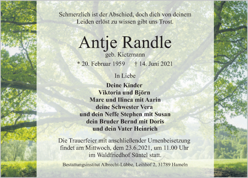 Hier finden Sie alle Traueranzeigen aus der Zeitung, die bisher für Antje Randle erschienen sind. Weitere Traueranzeigen, die in der Zeitung erscheinen, werden hier ebenfalls aufgelistet