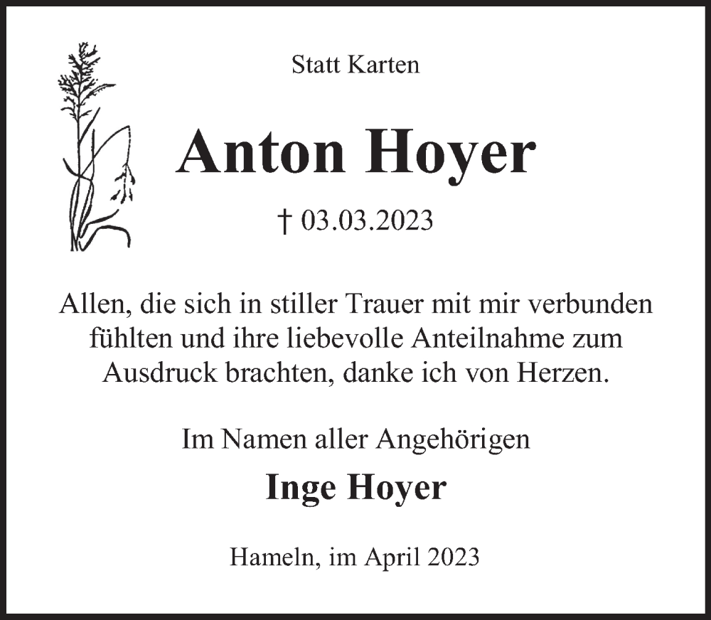 Hier finden Sie alle Traueranzeigen aus der Zeitung, die bisher für Anton Hoyer erschienen sind. Weitere Traueranzeigen, die in der Zeitung erscheinen, werden hier ebenfalls aufgelistet