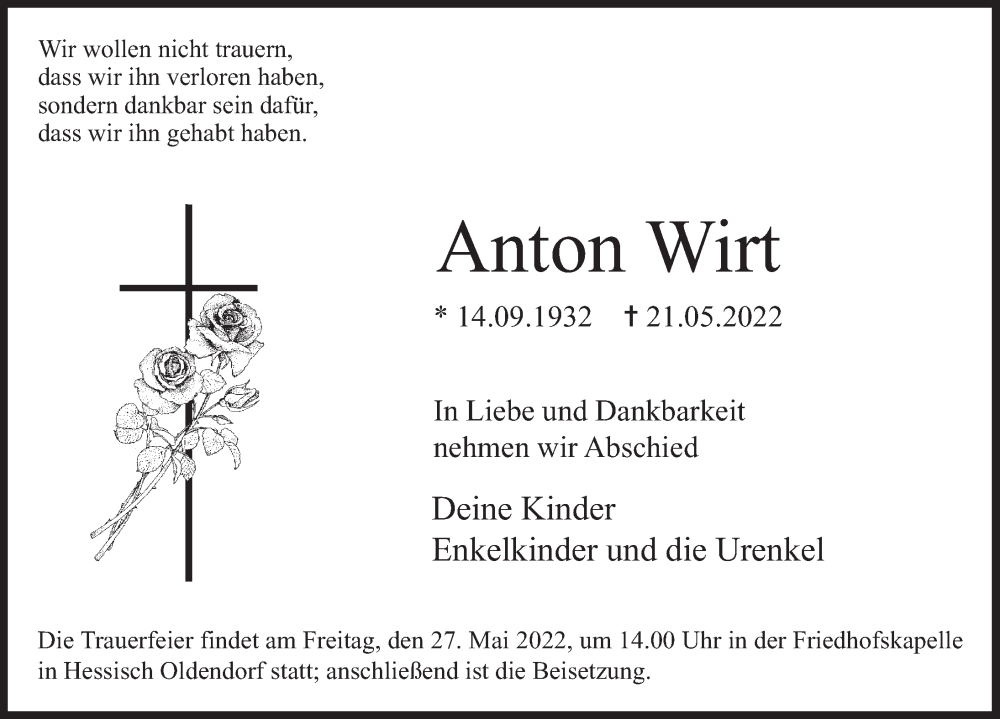Hier finden Sie alle Traueranzeigen aus der Zeitung, die bisher für Anton Wirt erschienen sind. Weitere Traueranzeigen, die in der Zeitung erscheinen, werden hier ebenfalls aufgelistet
