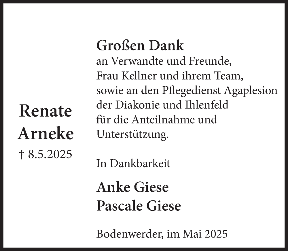 Hier finden Sie alle Traueranzeigen aus der Zeitung, die bisher für Arneke Giese erschienen sind. Weitere Traueranzeigen, die in der Zeitung erscheinen, werden hier ebenfalls aufgelistet