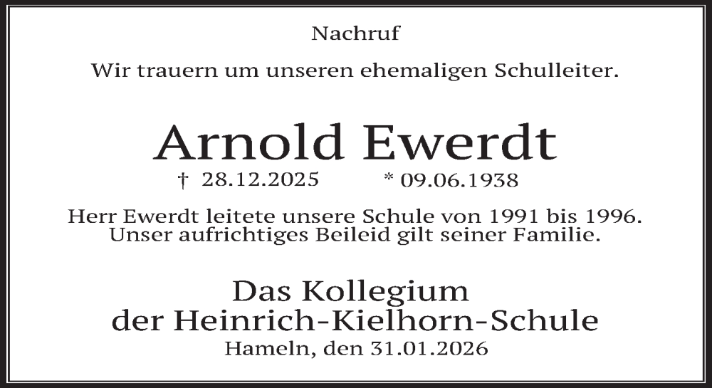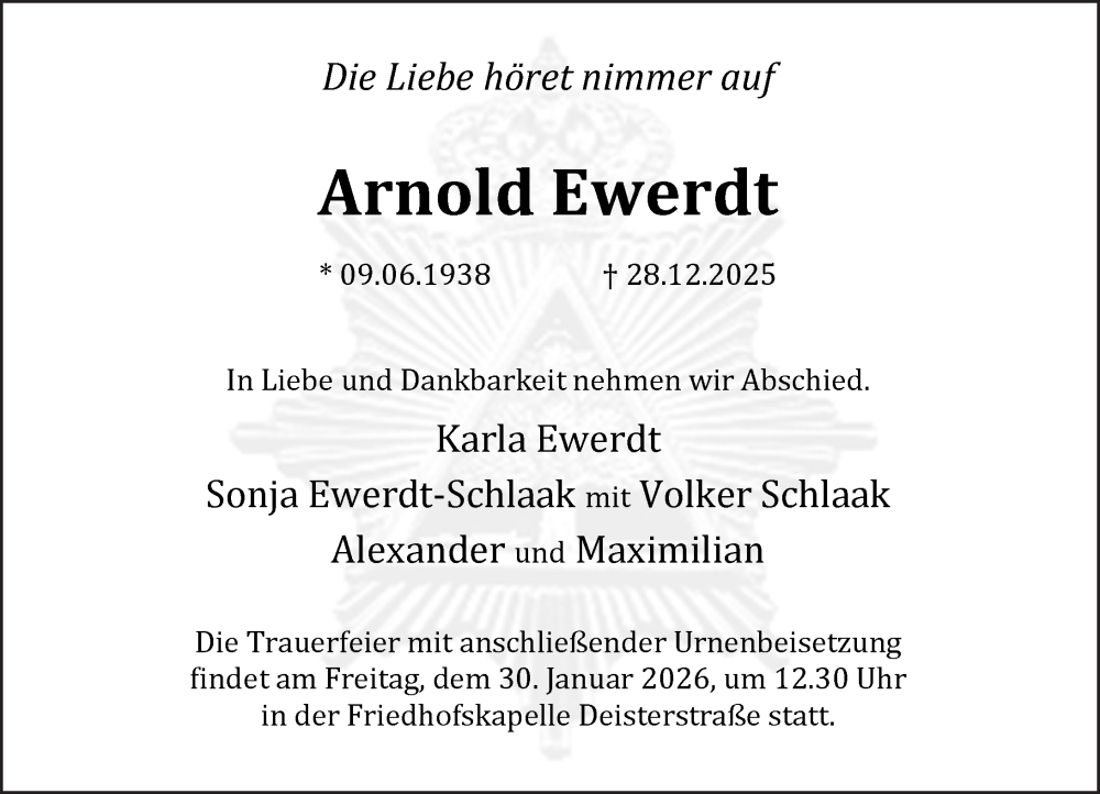Hier finden Sie alle Traueranzeigen aus der Zeitung, die bisher für Arnold Ewerdt erschienen sind. Weitere Traueranzeigen, die in der Zeitung erscheinen, werden hier ebenfalls aufgelistet