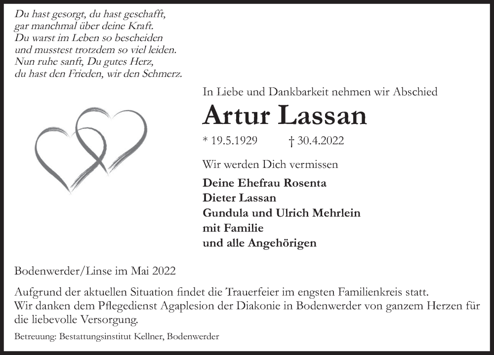 Hier finden Sie alle Traueranzeigen aus der Zeitung, die bisher für Artur Lassan erschienen sind. Weitere Traueranzeigen, die in der Zeitung erscheinen, werden hier ebenfalls aufgelistet