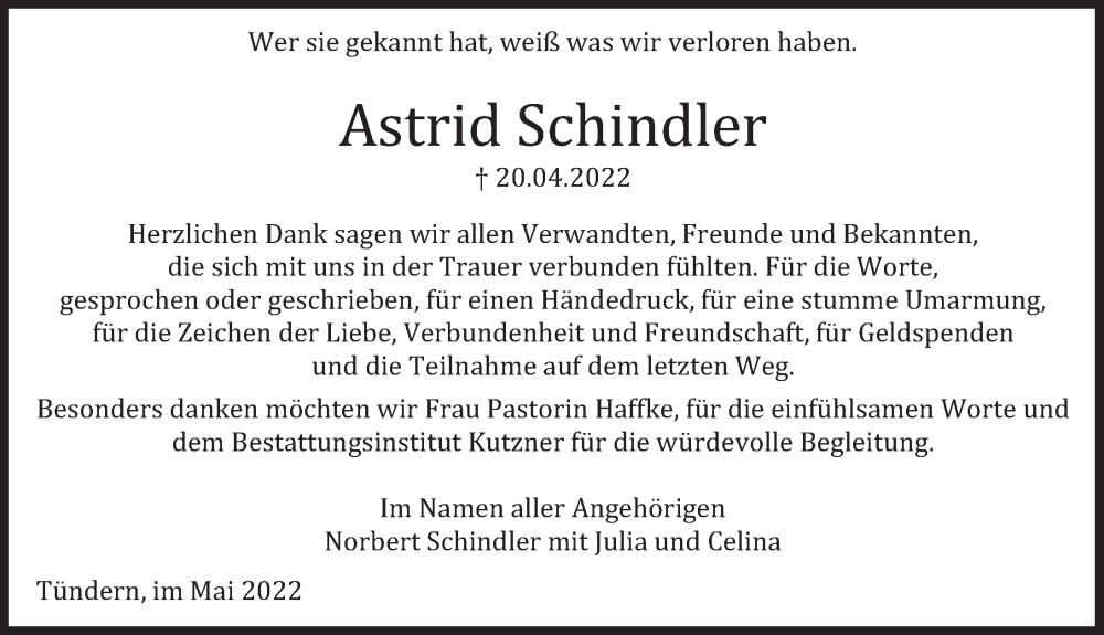 Hier finden Sie alle Traueranzeigen aus der Zeitung, die bisher für Astrid Schindler erschienen sind. Weitere Traueranzeigen, die in der Zeitung erscheinen, werden hier ebenfalls aufgelistet