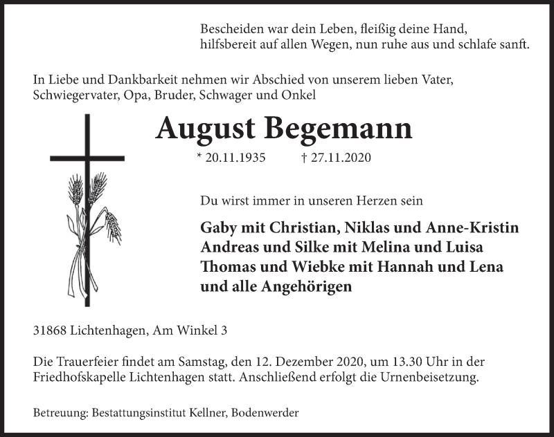 Hier finden Sie alle Traueranzeigen aus der Zeitung, die bisher für August Begemann erschienen sind. Weitere Traueranzeigen, die in der Zeitung erscheinen, werden hier ebenfalls aufgelistet