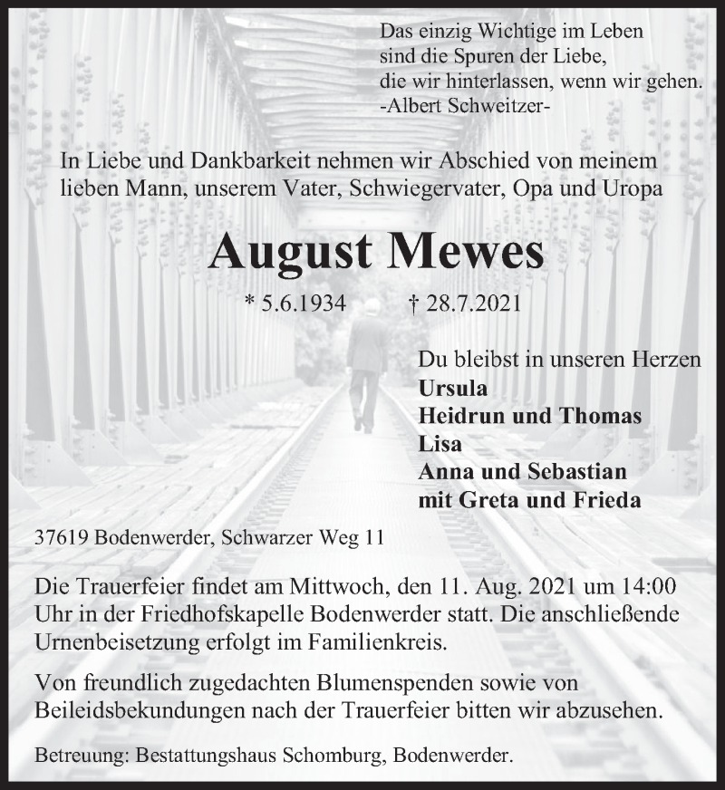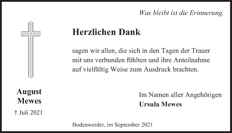 Hier finden Sie alle Traueranzeigen aus der Zeitung, die bisher für August Mewes erschienen sind. Weitere Traueranzeigen, die in der Zeitung erscheinen, werden hier ebenfalls aufgelistet