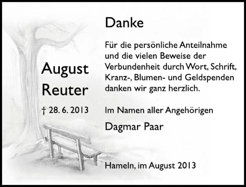 Hier finden Sie alle Traueranzeigen aus der Zeitung, die bisher für August Reuter erschienen sind. Weitere Traueranzeigen, die in der Zeitung erscheinen, werden hier ebenfalls aufgelistet