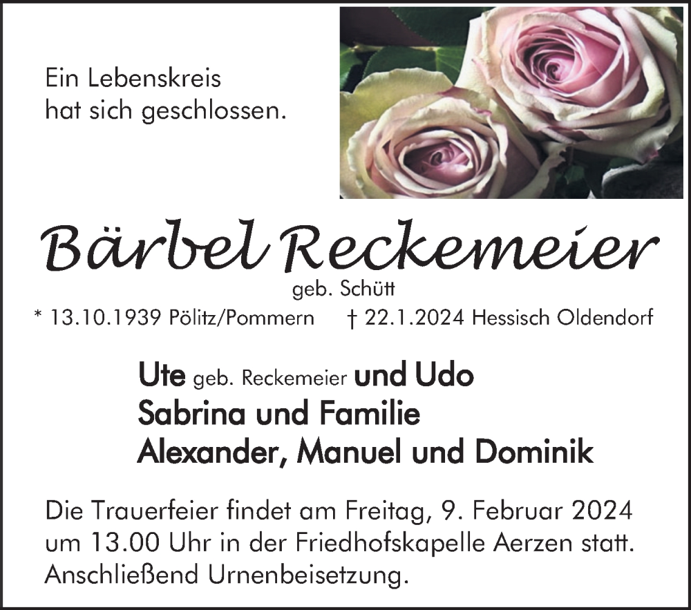 Hier finden Sie alle Traueranzeigen aus der Zeitung, die bisher für Bärbel Reckemeier erschienen sind. Weitere Traueranzeigen, die in der Zeitung erscheinen, werden hier ebenfalls aufgelistet
