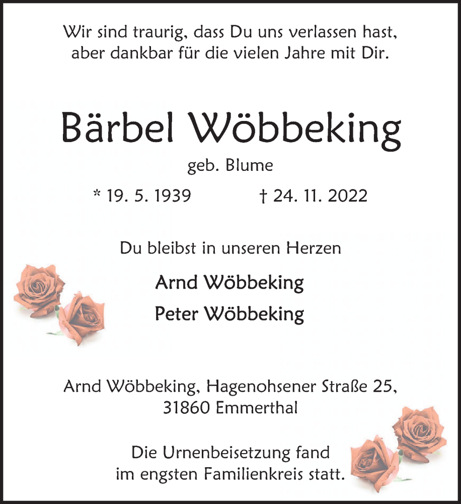 Hier finden Sie alle Traueranzeigen aus der Zeitung, die bisher für Bärbel Wöbbeking erschienen sind. Weitere Traueranzeigen, die in der Zeitung erscheinen, werden hier ebenfalls aufgelistet