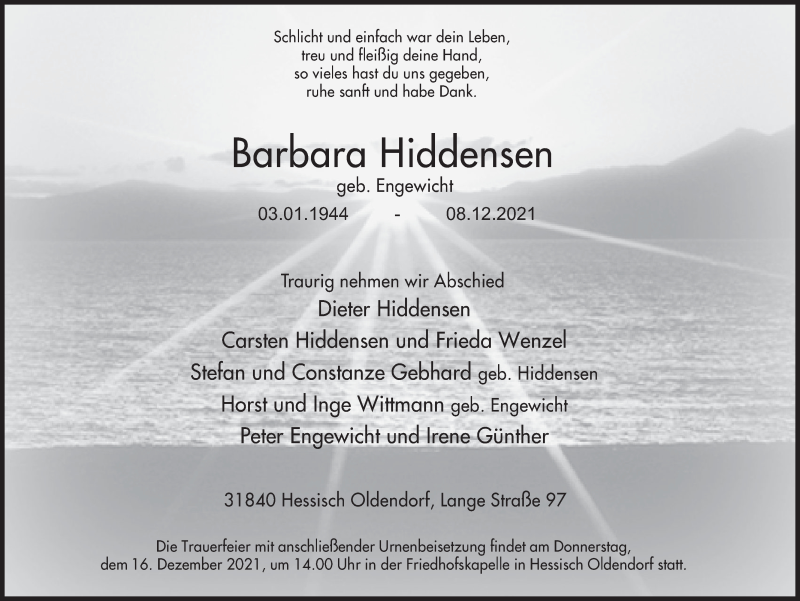 Hier finden Sie alle Traueranzeigen aus der Zeitung, die bisher für Barbara Hiddensen erschienen sind. Weitere Traueranzeigen, die in der Zeitung erscheinen, werden hier ebenfalls aufgelistet
