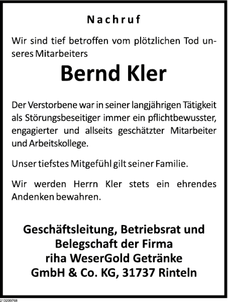 Hier finden Sie alle Traueranzeigen aus der Zeitung, die bisher für Bernd Kler erschienen sind. Weitere Traueranzeigen, die in der Zeitung erscheinen, werden hier ebenfalls aufgelistet